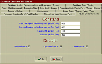 This utility allows you to pre-set the "Default" values in the Estimate Component for each time you enter a record. By changing the "Constants" you alter the specifics (labour, equitment, profit margin and, of course, taxes). This type of customization is unique to Landscape Illustrator.